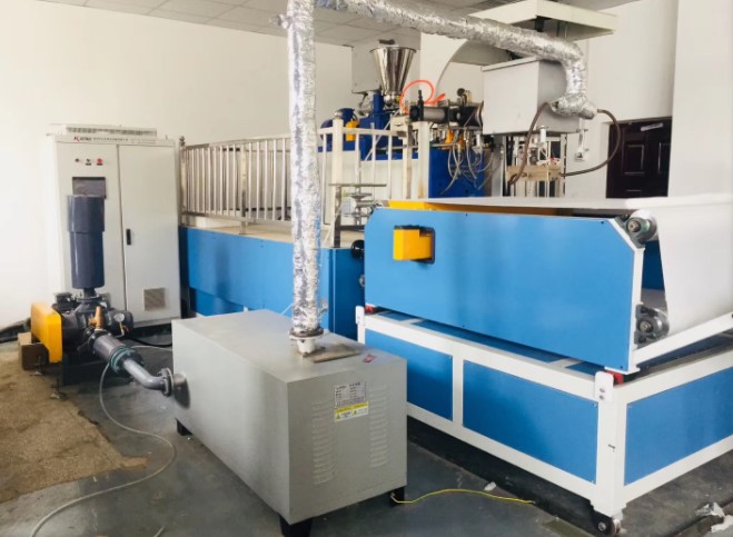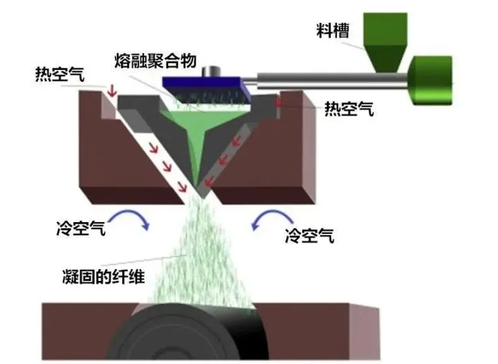 熔噴布的生產工藝分為:聚合物準備→熔融擠壓→計量泵→熔噴模頭組合件→熔體細流拉伸→冷卻→接收裝置。