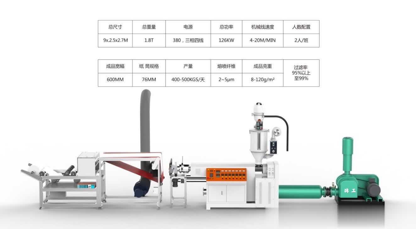 目前市場上面的設(shè)備大小生產(chǎn)線比較多,從300到3200mm寬幅都有,配置也是有很大的區(qū)別,熔噴布設(shè)備主要核心部件在于: ?羅茨鼓風(fēng)機,空氣加熱器,自動吸料烘干機,單螺桿擠出機,過濾器,熔體計量泵,噴絲模頭,接布臺,靜電駐極機,切布及卷布。