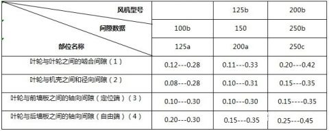 裝配間隙系20℃時的理論靜態間隙值。其能保證在額定工況下滿足動態時所需之工作間隙。為此,裝配間隙乃是保證風機性能和安全運用的重要因素。每臺羅茨風機出廠時,皆已對裝配間隙進行調整,用戶不得隨意變動。具體間隙值見下表: